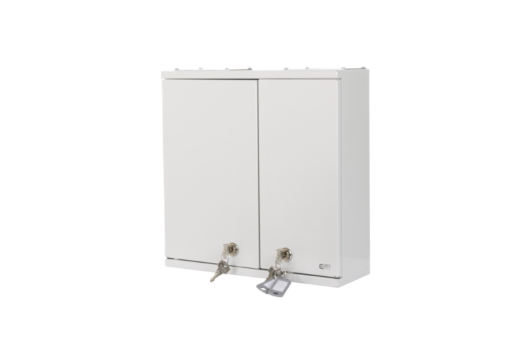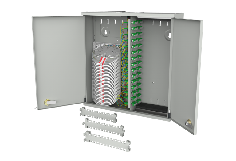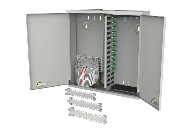 Stabiles Stahlbech-Gehäuse mit getrennten Installer/Customer-Zugängen. Die Gehäuse gibt es in verschiedenen Größen für bis zu 48-Kupplungen. Austauschbare Einsätze für die Kabeleingänge und –Ausgänge ermöglichen den Einsatz für eine Vielzahl von Anwendungen.